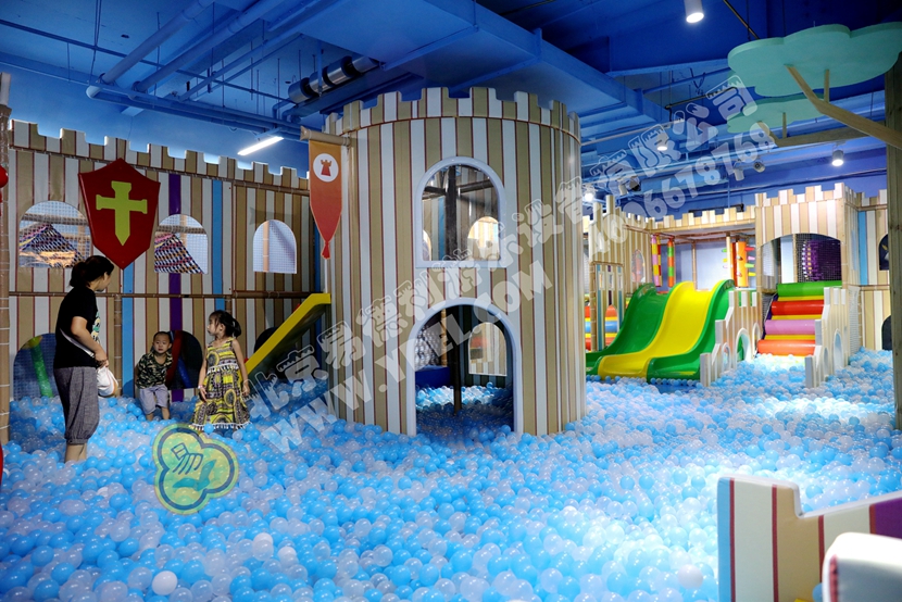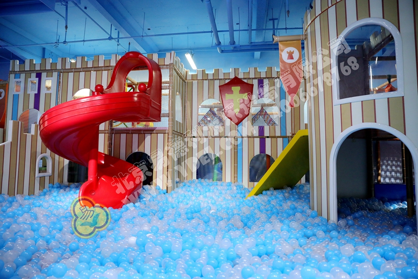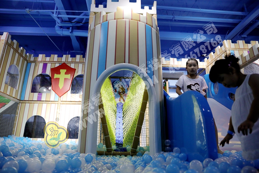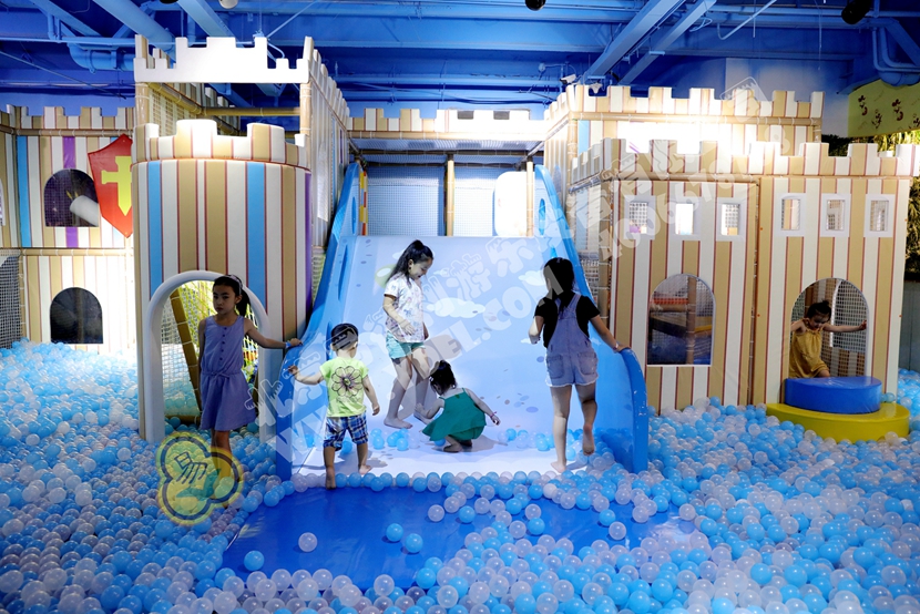 全新城堡主題,藍(lán)白半透明海洋球仿佛天空中的云朵,碩大的城堡沖入云霄,可謂真正的天空之城。腳下踩著云,去挑戰(zhàn)那城堡上的刺激,哪個(gè)孩子不愛呢?