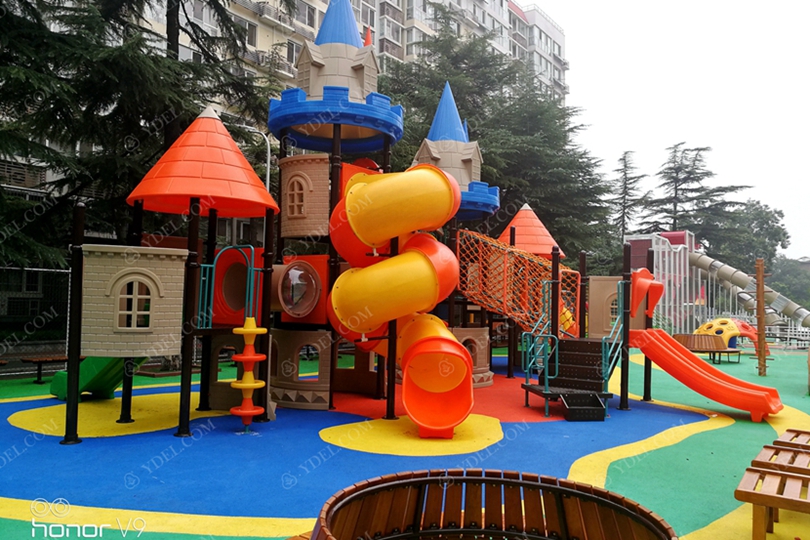 幼兒園戶外組合滑梯由以下配件組合而成,因此得名組合滑梯:門、過橋、滑筒、頂子、爬梯、扶手、臺板、立柱、滑梯、攀爬管、和繩網;幼兒園滑梯全 部用扣件連接,表面沒有任何尖銳物確保小孩子在游玩時候的安全。