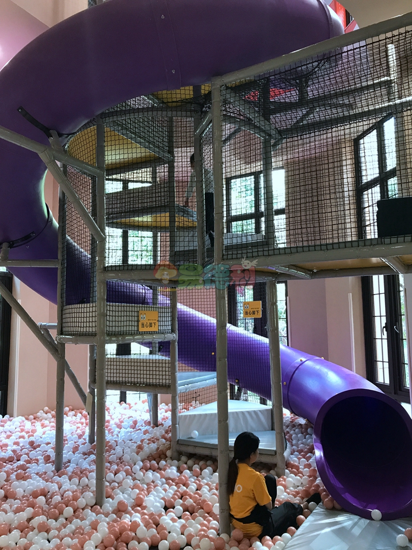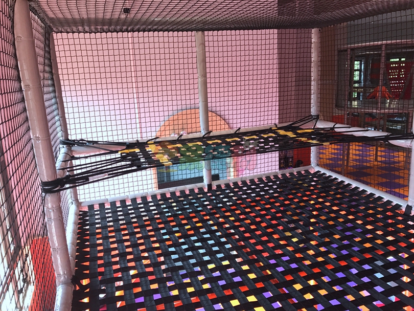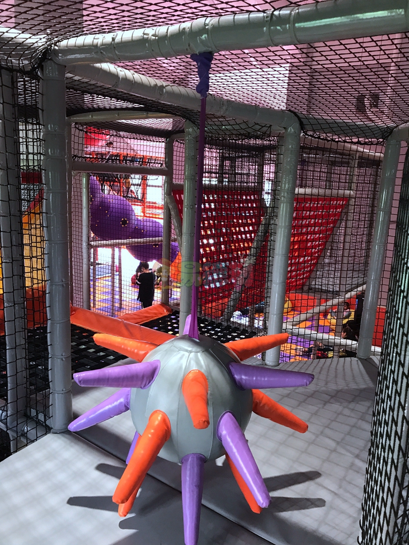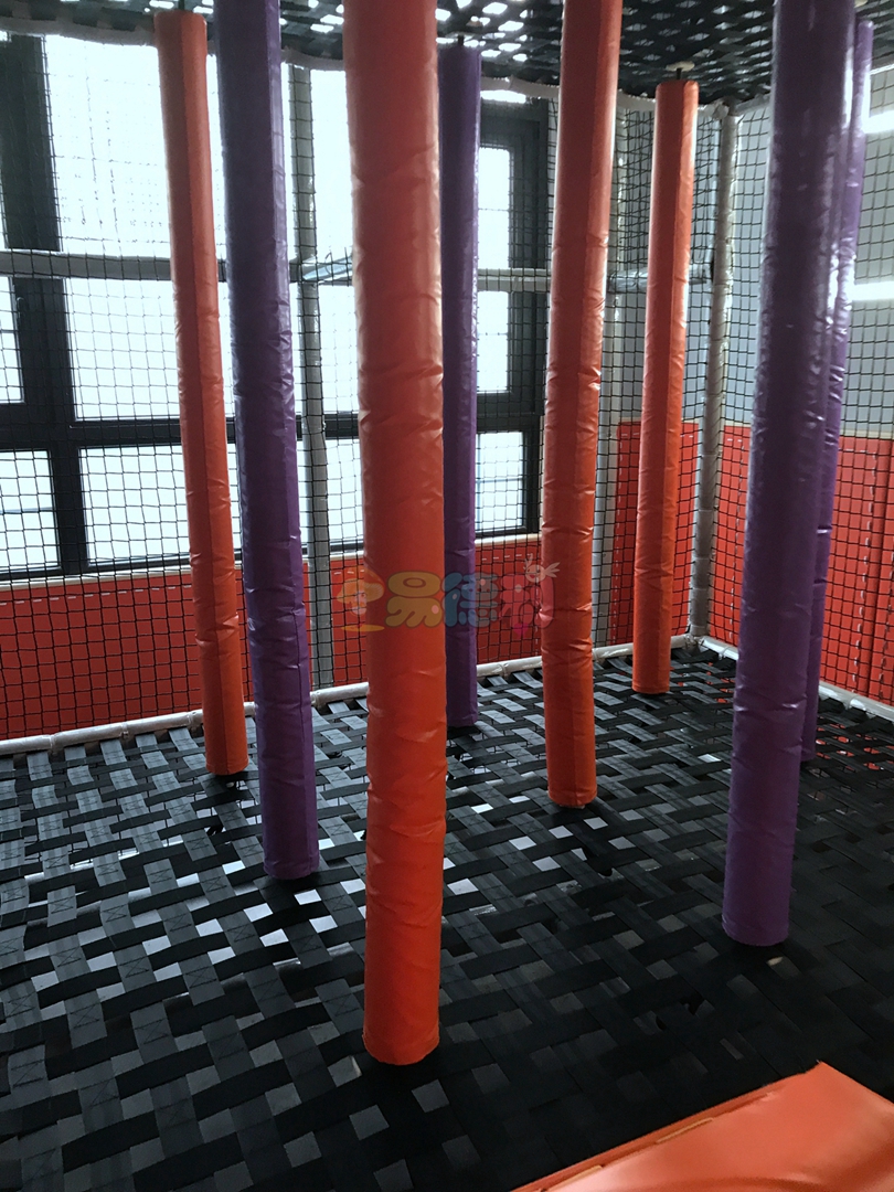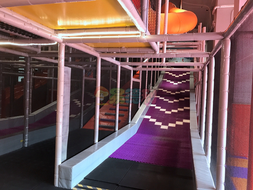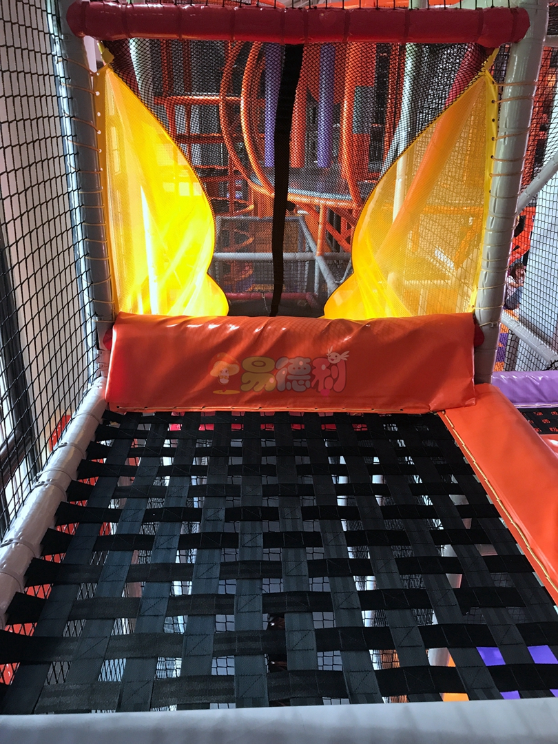 平臺全部是鏤空的,并且富有彈性,上下層通透,有一種高空探險的感覺,淘氣堡內部阻礙重重,蕩橋、梅花樁、星型錘、彩虹梯、滑草等游樂項目應有盡有,讓孩子們樂此不疲!
