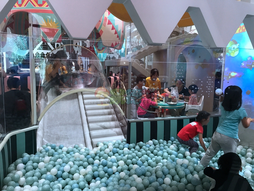 在暢玩之后,家長們就可以帶著小朋友來餐廳享受美味佳肴了。餐廳的設計風格也是別具匠心,四周有很多像熱氣球懸掛著的游戲盒子,幽長的透明隧道串聯起這些游戲屋,小朋友們可以在里面爬來爬去嬉戲玩鬧。就餐位置離這些游戲屋很近,讓家長們可以在用餐的同時也可以照看到自己的小寶寶。餐廳區還準備了兩個VIP的房間對于想安靜就餐的家長和孩子又是一大福音!