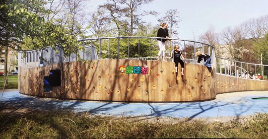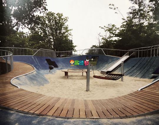 游樂場由上升的環形物體構成,不僅提供了曲線通向滑道,同時也構成了一個兩邊都可以攀爬的邊緣。垂直的外墻是由鉆有孔眼和圓形攀爬拉環的條形木塊構成。環形物體內部由藍色的波浪形斜坡和沙坑組成。這個區域的幾個通道為兒童提供玩耍和休息的空間,同時也為那些有缺陷的兒童提供了一個隱蔽的地方。用于攀爬的木墻適合每一個兒童,依靠自己的力量、采用不同的方式都有可能得到玩耍的機會。在環形物體周圍和上面都有寬闊的空間,適合一些積極的、重復移動的活動(轉彎、滑行、跳躍、搖擺),建造活動(沙子) 以及幻想游戲(隧道、平臺、遮蓋物) 等。