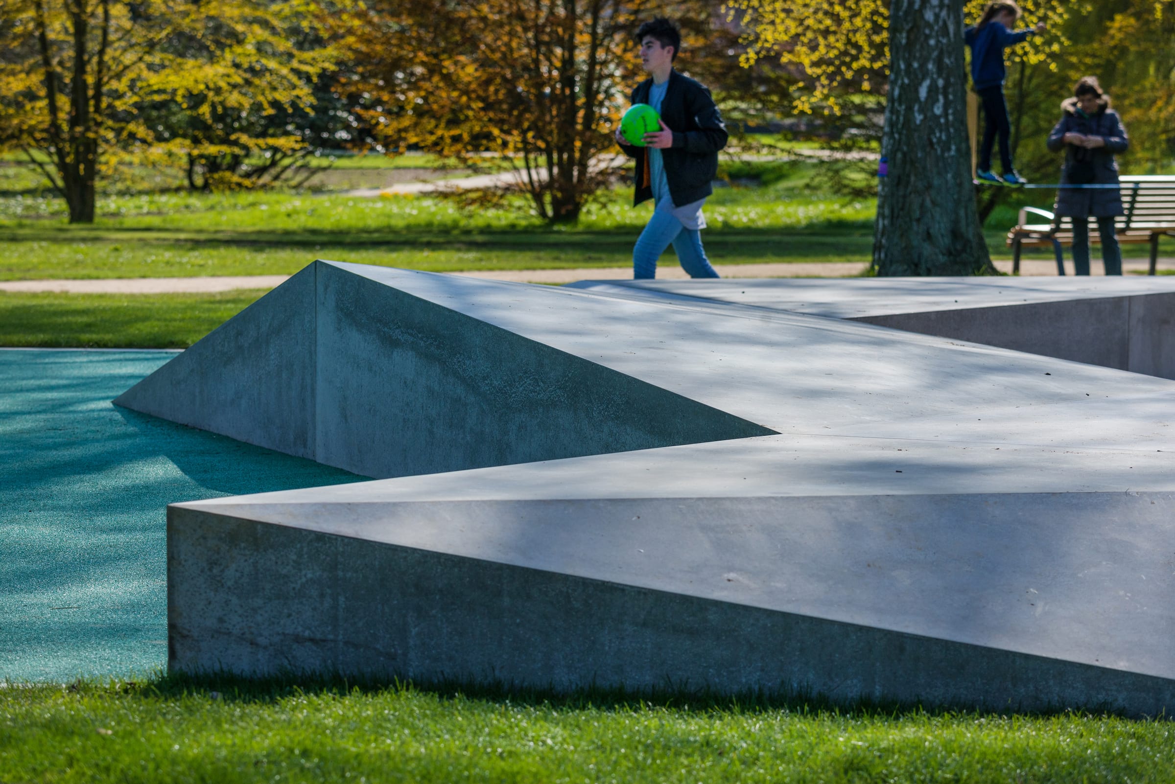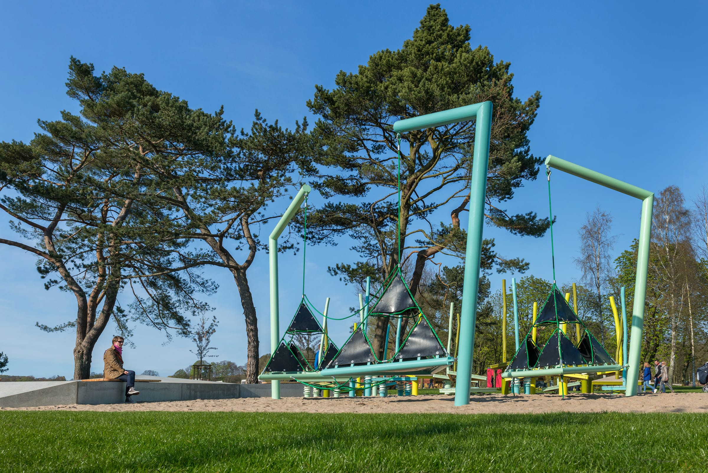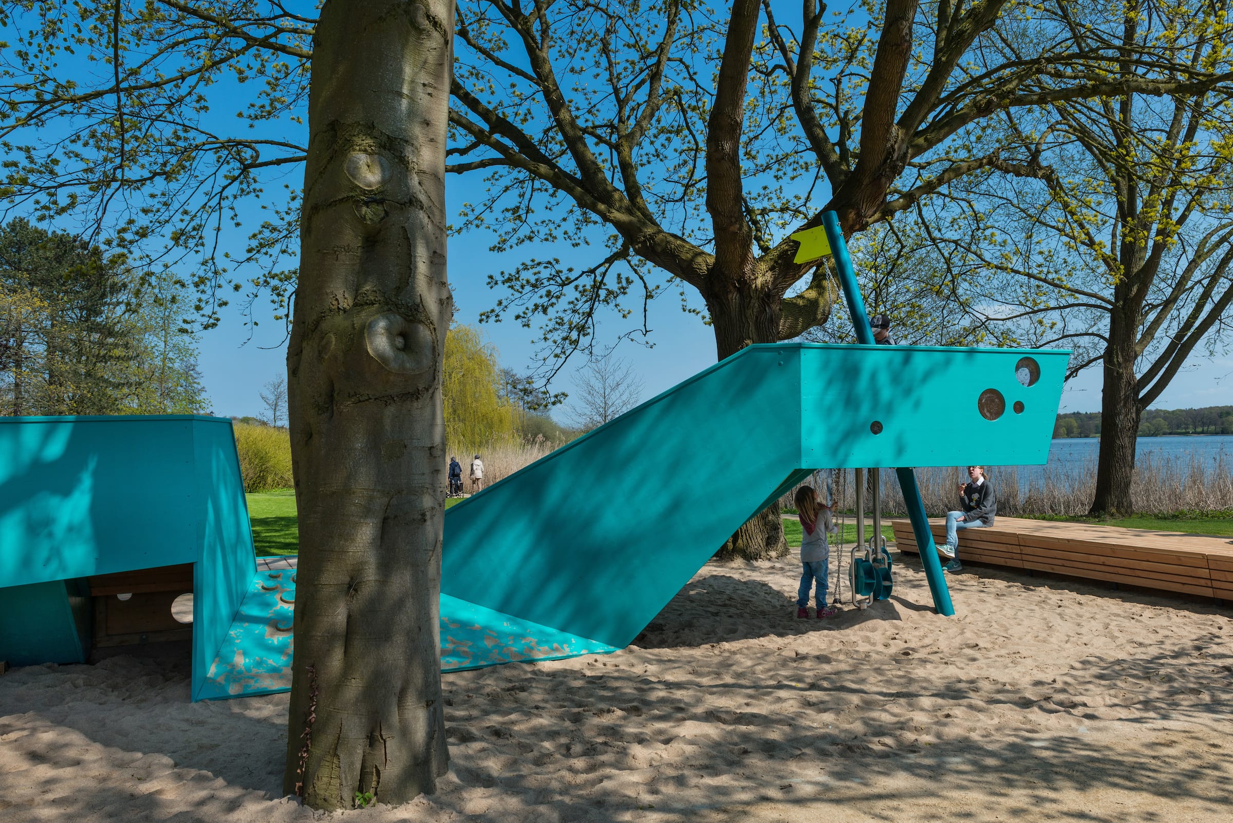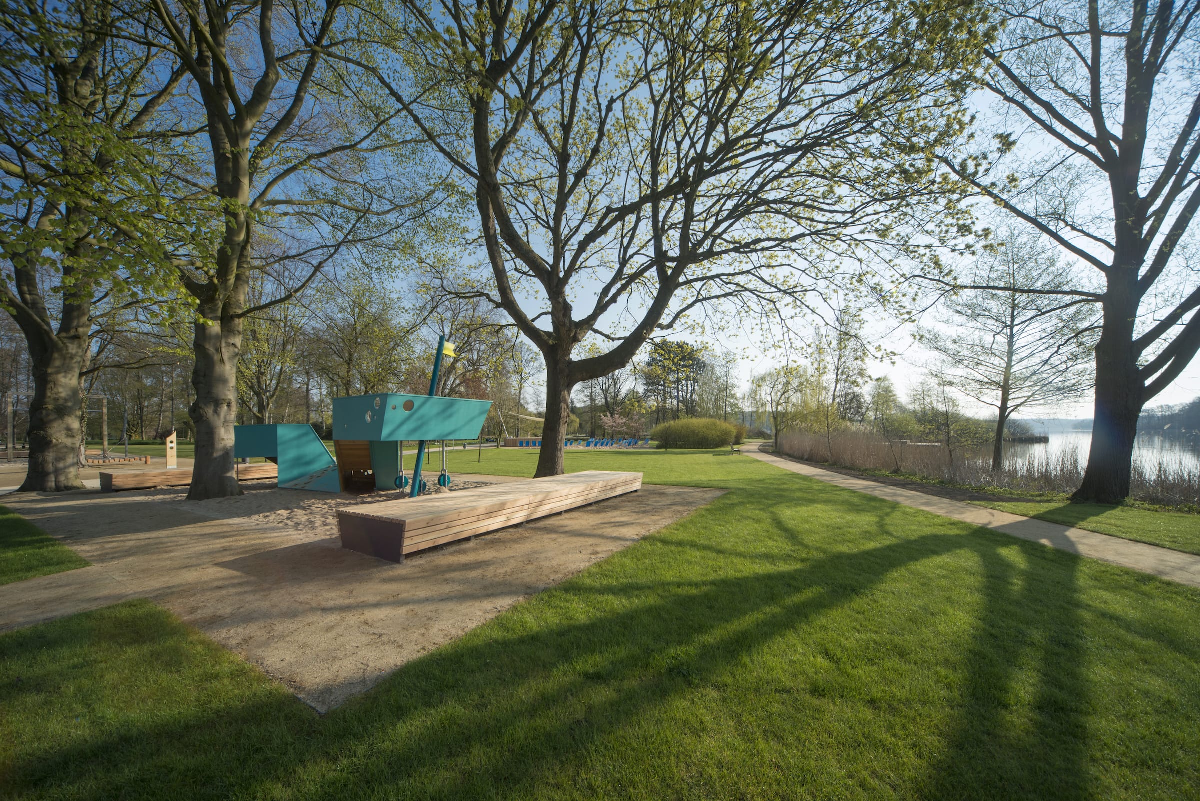 作為與歷史悠久的Schlossgarten公園形成對比的一個景觀,Seepark已發(fā)展成為一個娛樂性的景觀,為家庭、兒童和青少年提供了各種各樣的活動空間,緩解了以前對地標(biāo)保護(hù)花園的過度使用。除了開闊的放松區(qū)域,它還提供了許多戶外活動機(jī)會,為兒童和青少年舉辦講習(xí)班,設(shè)計(jì)他們自己的游戲和運(yùn)動場地。沙灘上有日光浴區(qū),也有沙灘排球和街球的場地。“湖泊”和“森林”的主題是在一個多層面的、挑戰(zhàn)性的面向兒童的游戲世界中體現(xiàn)的,這為他們的感官而打造:攀爬可以測試他們的平衡和靈活性;網(wǎng)狀隧道像魚網(wǎng)一樣伸展,覆蓋在模型塑料表面;帶有擋泥板的松緊繩索也可以攀爬;移動的柱子創(chuàng)造了一個“搖擺的森林”;樹屋正在建造中。整個公園都有野餐和燒烤的地方。